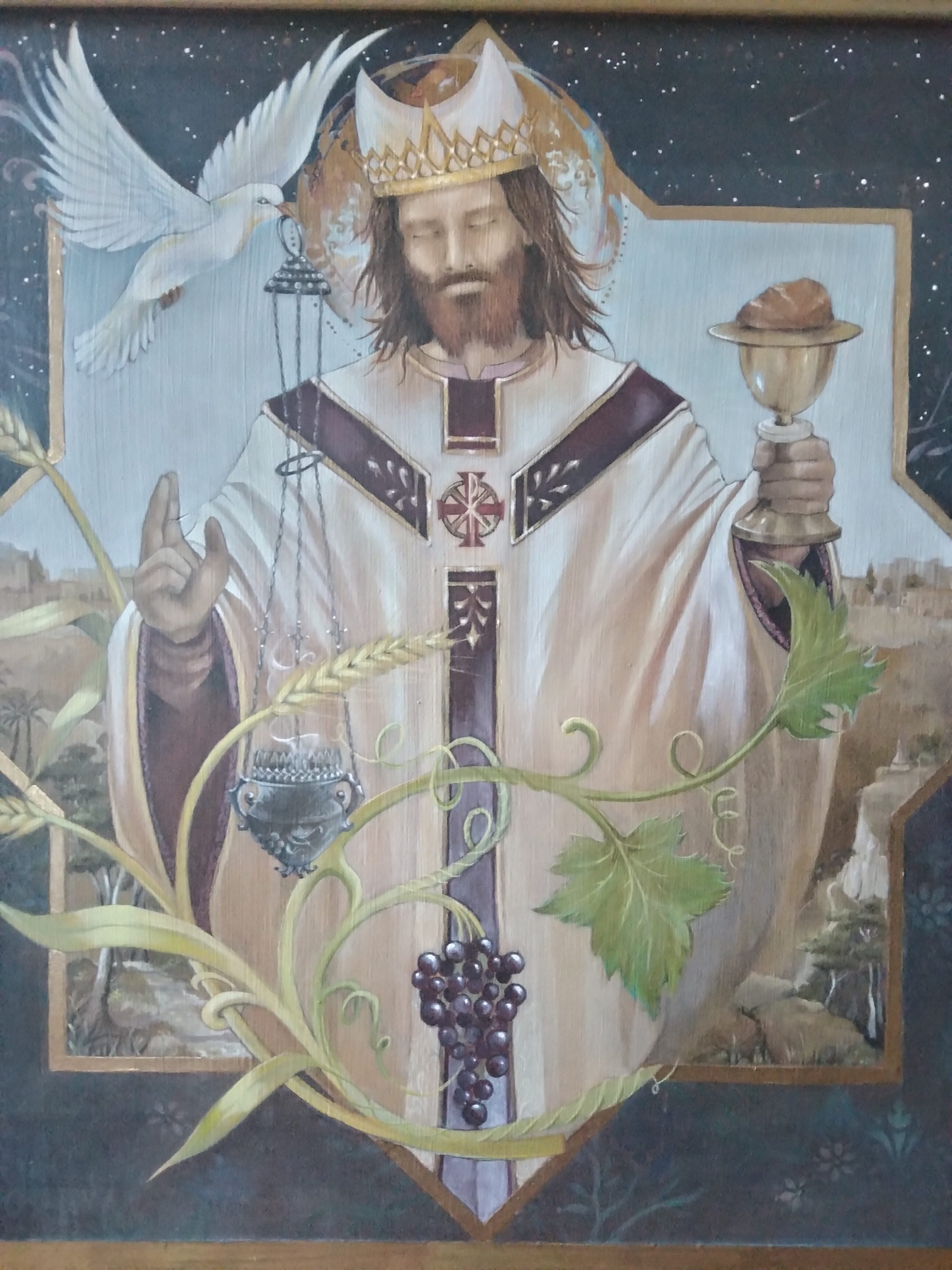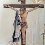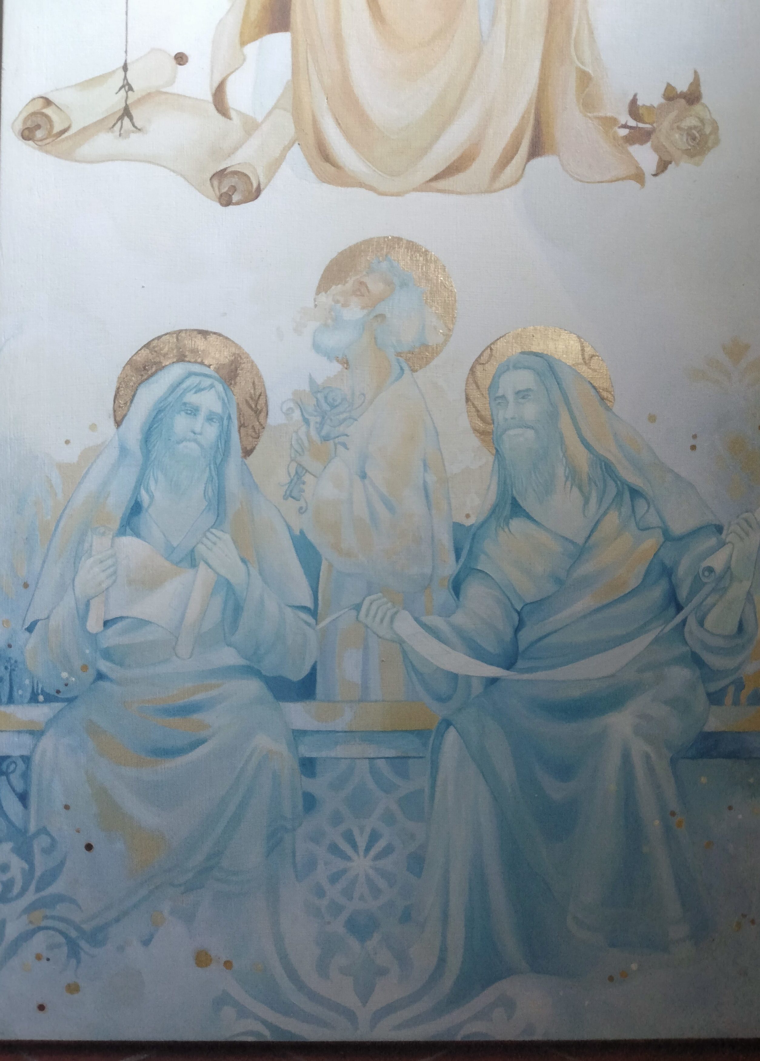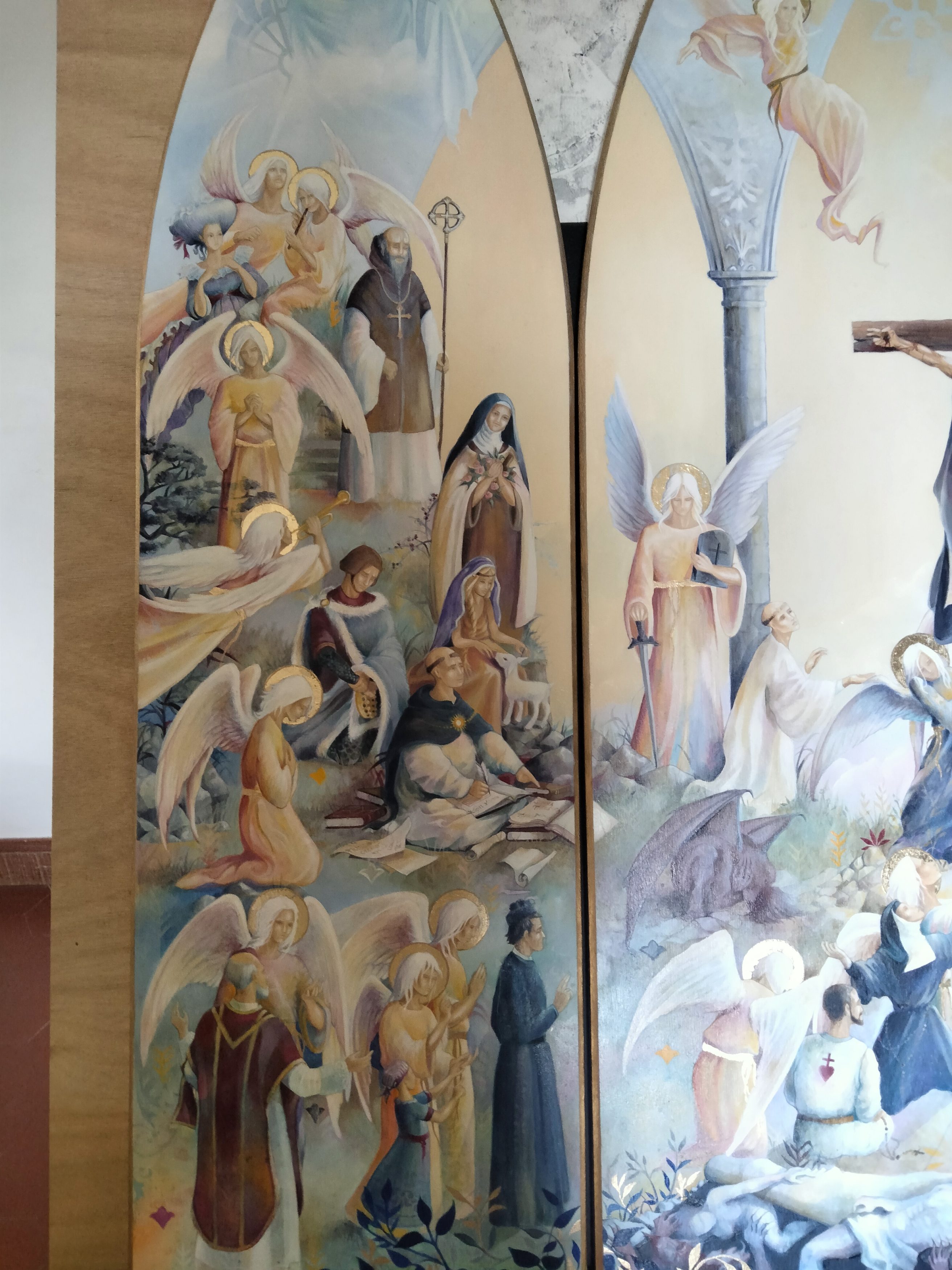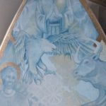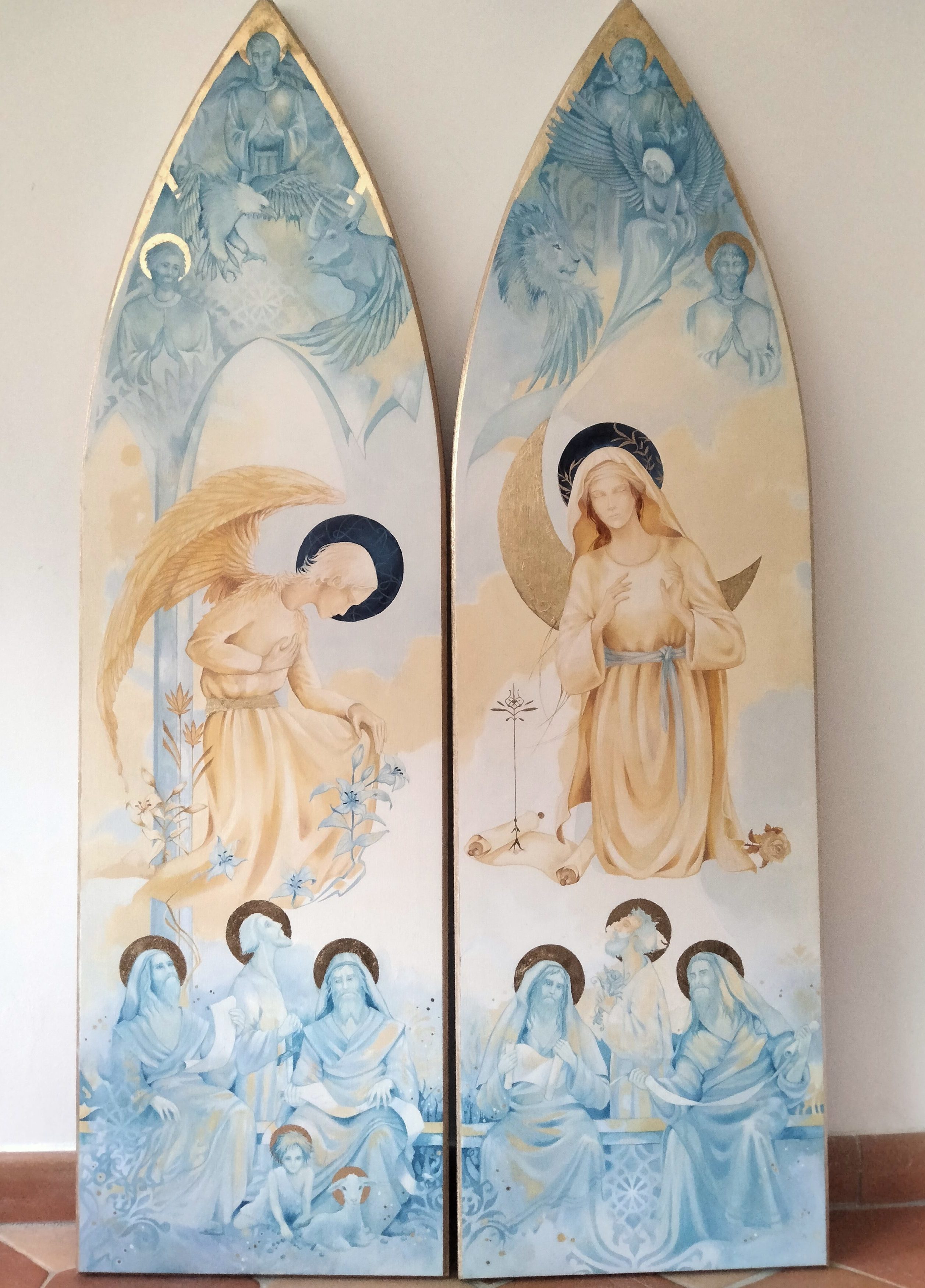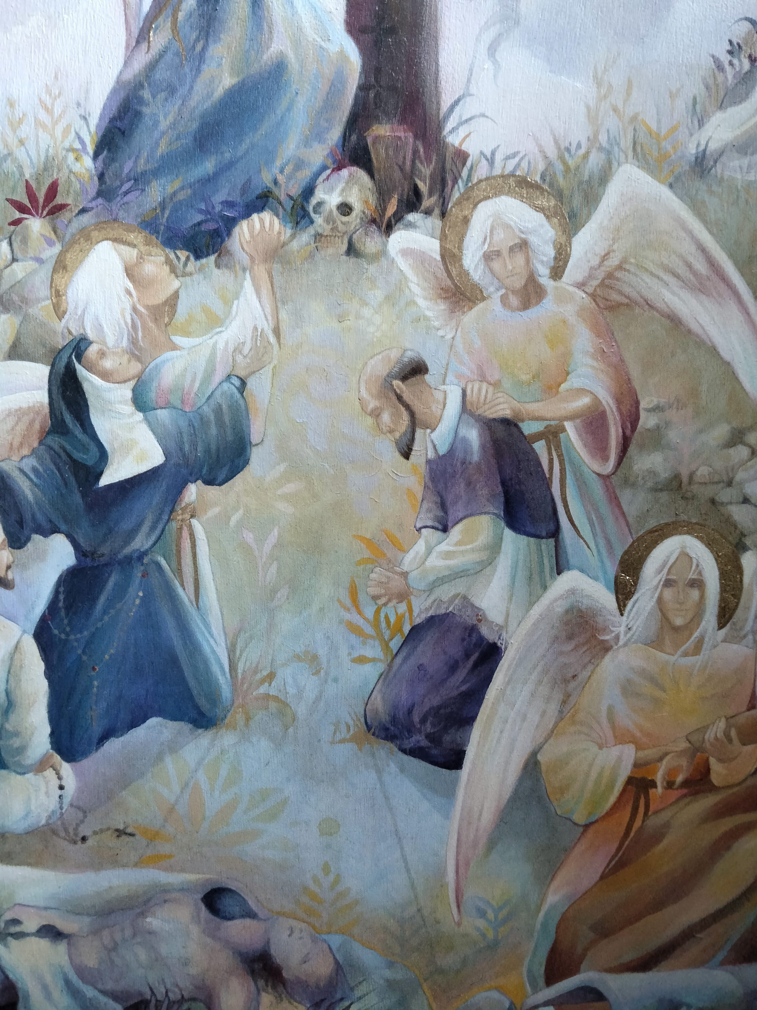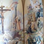 Pour le triptyque, c’était la première fois que je faisais une œuvre de cette envergure, le défi était pour moi énorme car je suis véritablement néophyte en peinture », partage Ségolène. La technique utilisée pour le retable est la peinture à l’huile car plus pérenne dans le temps, travaillée avec des glacis permettant des effets de transparences, et quelques touches de feuilles d’or. L’intérieur du triptyque est composé d’un panel de couleurs représentant la crucifixion de Jésus-Christ, avec de nombreux saints et leur ange gardien. C’est une œuvre singulière, par la présence de la Sainte Vierge Marie qui donne un baiser sur la joue de Son fils.