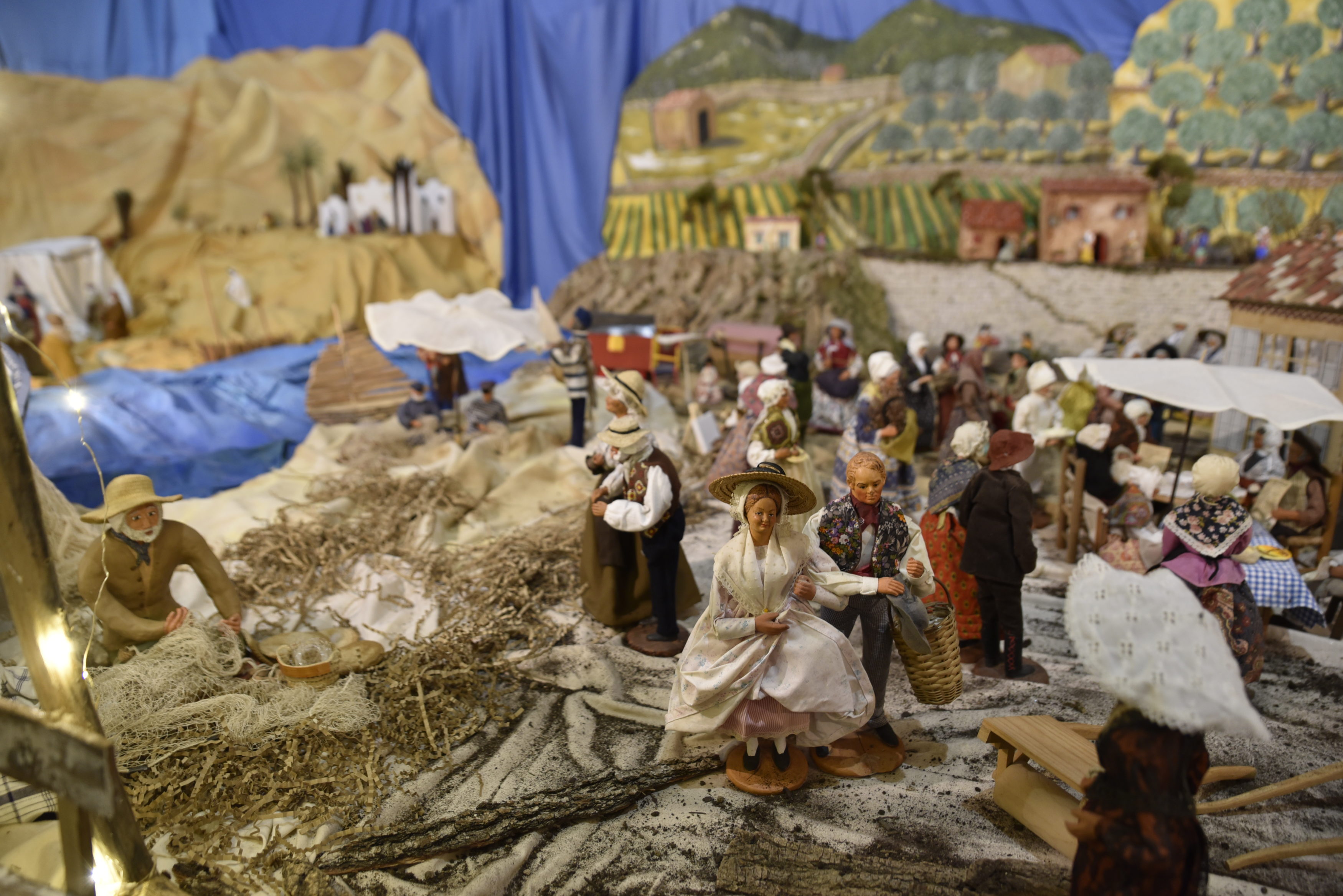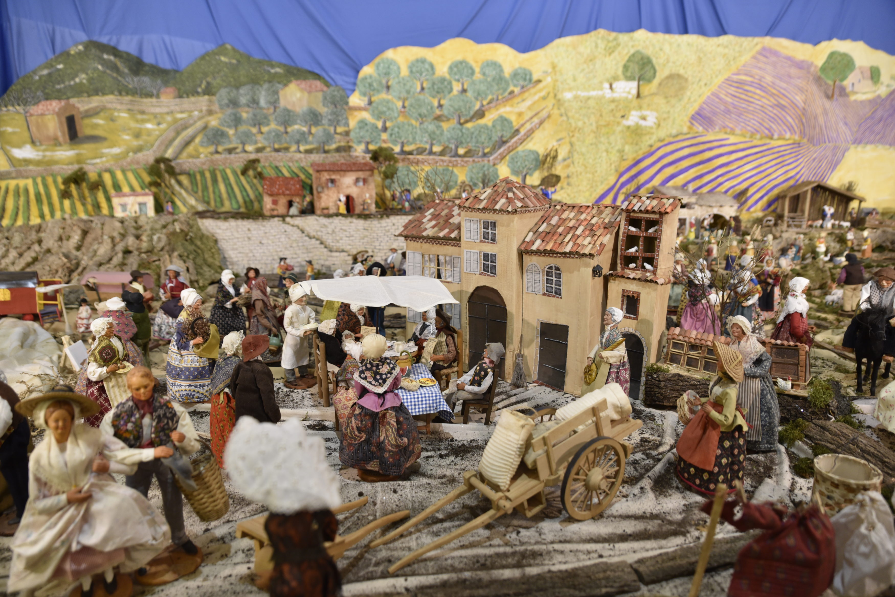 D’autres métiers tels que le boulanger sont représentés. « Le boulanger était très important, j’ai donc voulu montrer les étapes du cheval avec le foulage du blé sur le sol caladé par des galais, qui permettait de balayer et de ne garder que les grains de blé, que l’on portait ensuite au moulin pour le faire moudre. L’apiculteur avait également une place essentielle en Provence avec ses ruches posées au bord des champs de lavandes pour faire le miel. La couturière et sa machine à coudre rustique et ses bobines. Les troupeaux de moutons. La scène du repas au bord de mer des pêcheurs qui pendant que les femmes cuisinent, eux réparent les trous dans les filets. Dans la campagne les hommes lisent le journal, l’un d’entre eux apporte le gâteau chaleureusement préparé par le pâtissier. On peut voir aussi pour plus de fête la pêche au canard, les anneaux, les quilles, le casse boîtes », poursuit la créatrice.