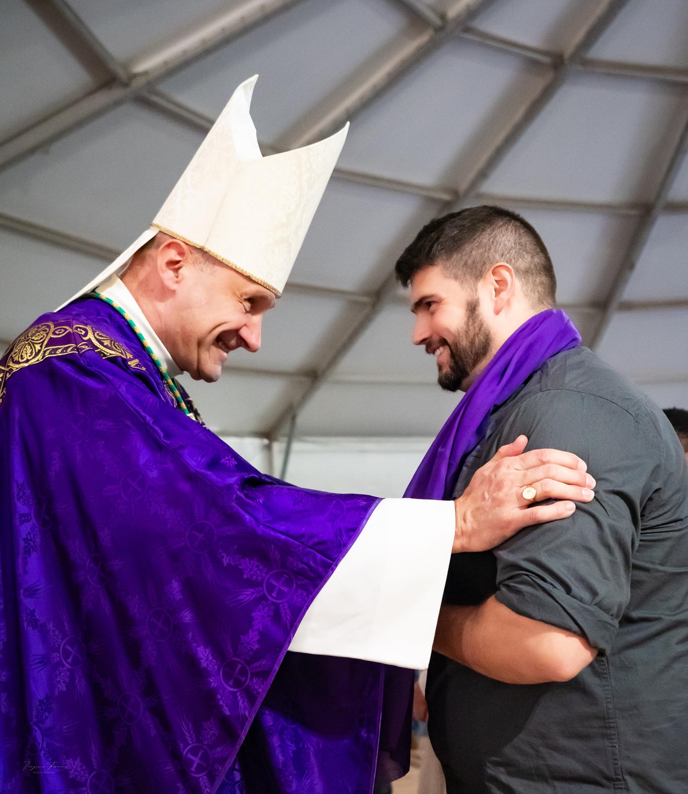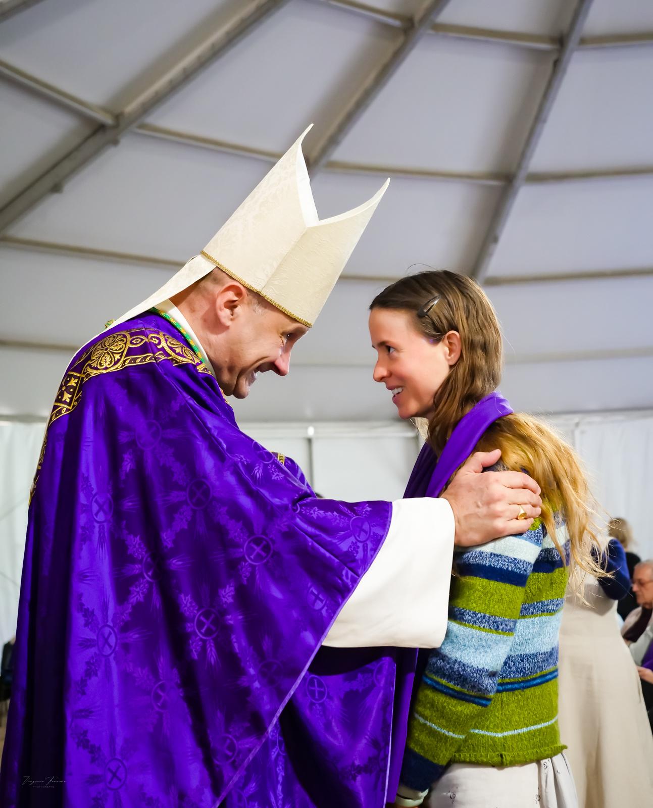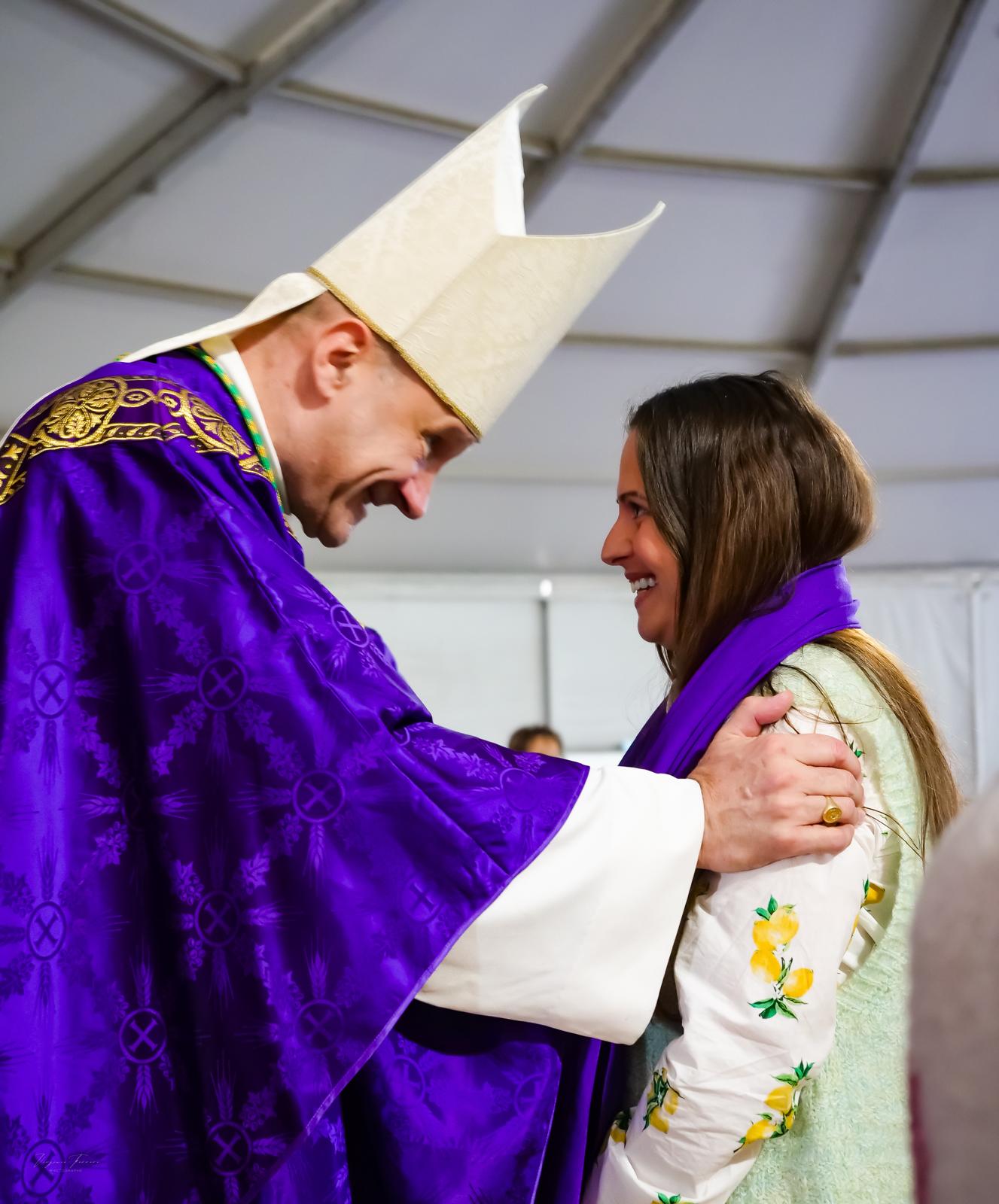 Le dimanche 22 février, ce fut au tour des catéchumènes adultes de répondre à cet appel : « Beaucoup ont été touchés par la beauté des louanges et en avaient les larmes aux yeux. Le fait d’être tous ensemble leur a fait réaliser l’importance de cet appel et ils aimeraient bien revivre ce genre de journée très sympathique. Ils ont également été touchés par la disponibilité de Monseigneur TOUVET vis-à-vis de chacun en particulier, de voir la joie qu’il montrait dans les rencontres avec eux. C’est un père aimant qu’ils ont pu découvrir et ils ont vraiment aimé l’homélie. D’autre ont également trouvé très émouvant la remise de l’écharpe. Une journée donc particulièrement riche en grâces pour tous ces jeunes qui cherchent Dieu avec leur fraîcheur malgré un monde bouleversé et déstabilisant », partage Rose-Marie.