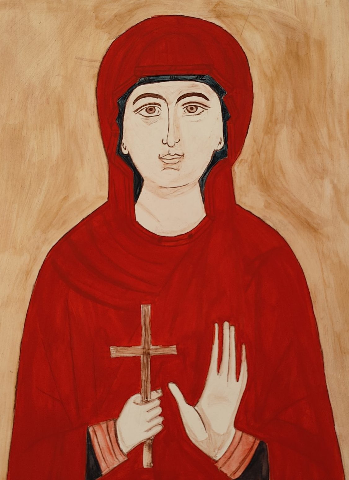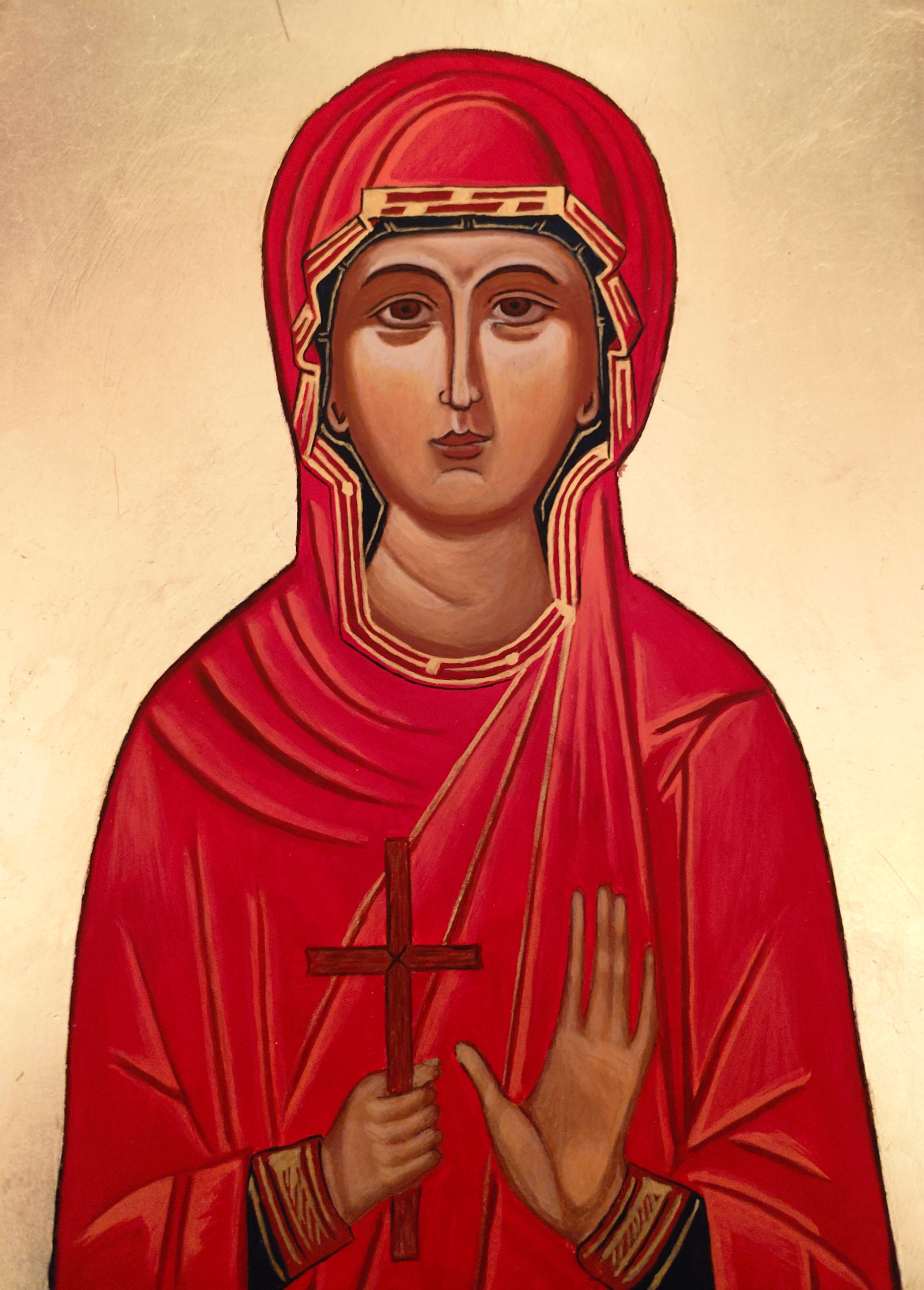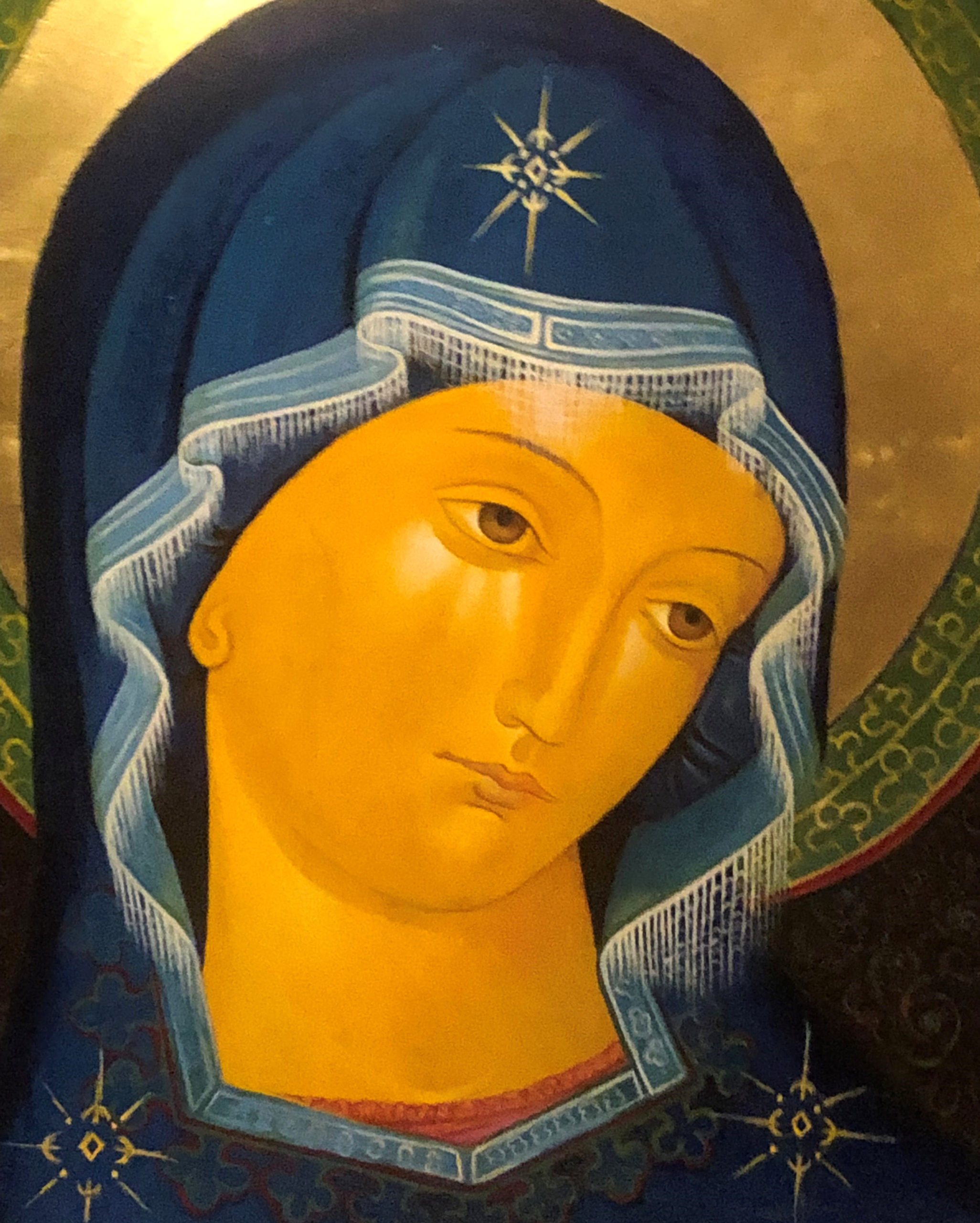 Plusieurs étapes s’en suivent : d’abord on calque une icône déjà existante de la Vierge Marie, ensuite on prend une planche de bois de tilleul, on l’enduit de plusieurs couches de lewka (composé de colle de peau de lapin et de craie en poudre puis on met le calque sur cet enduit pour y graver le dessin de la Vierge Marie. « Pour rester dans la paix et en prière, il est essentiel de créer un dessin simple avec un processus codifié pour travailler l’esprit tranquille », précise-t-il. Une fois cette étape achevée, on pose la feuille d’or minutieusement sur les contours du visage.