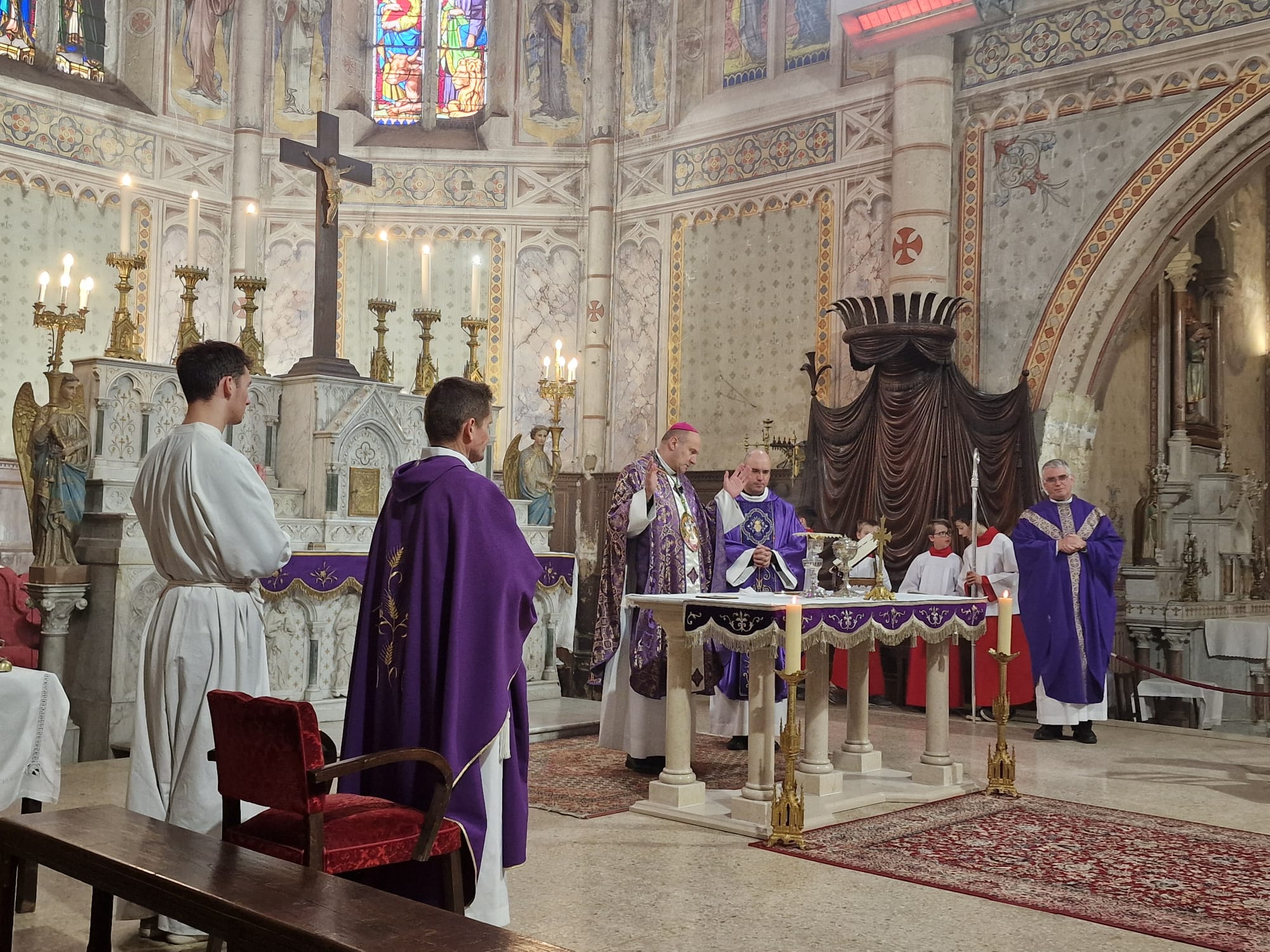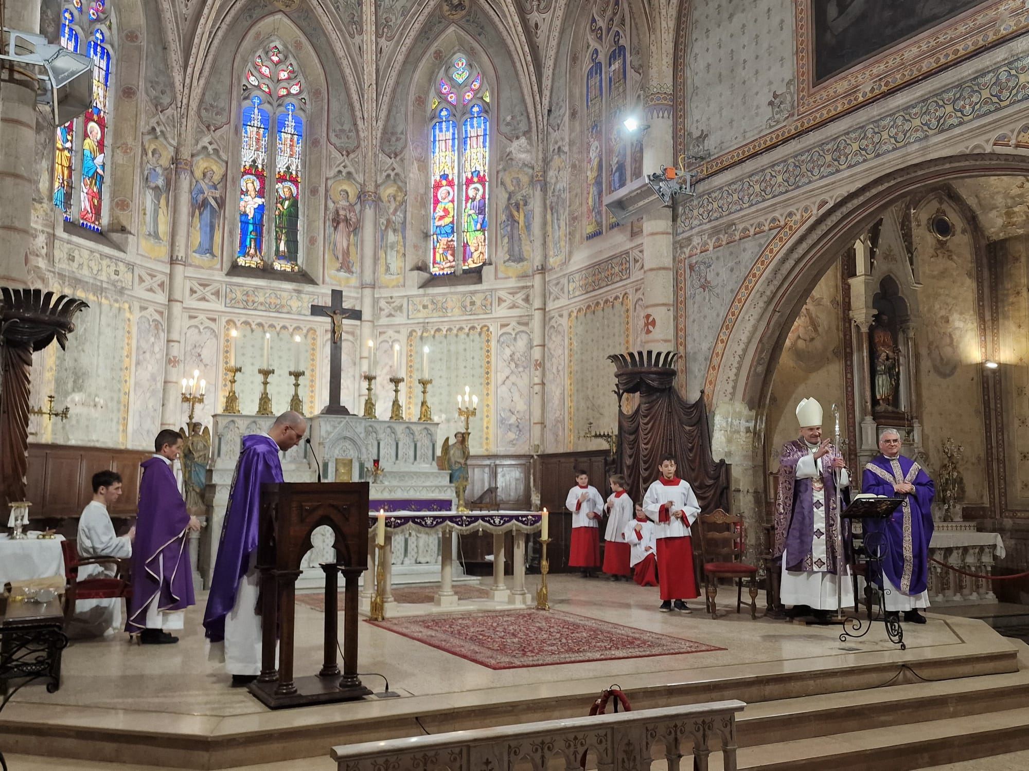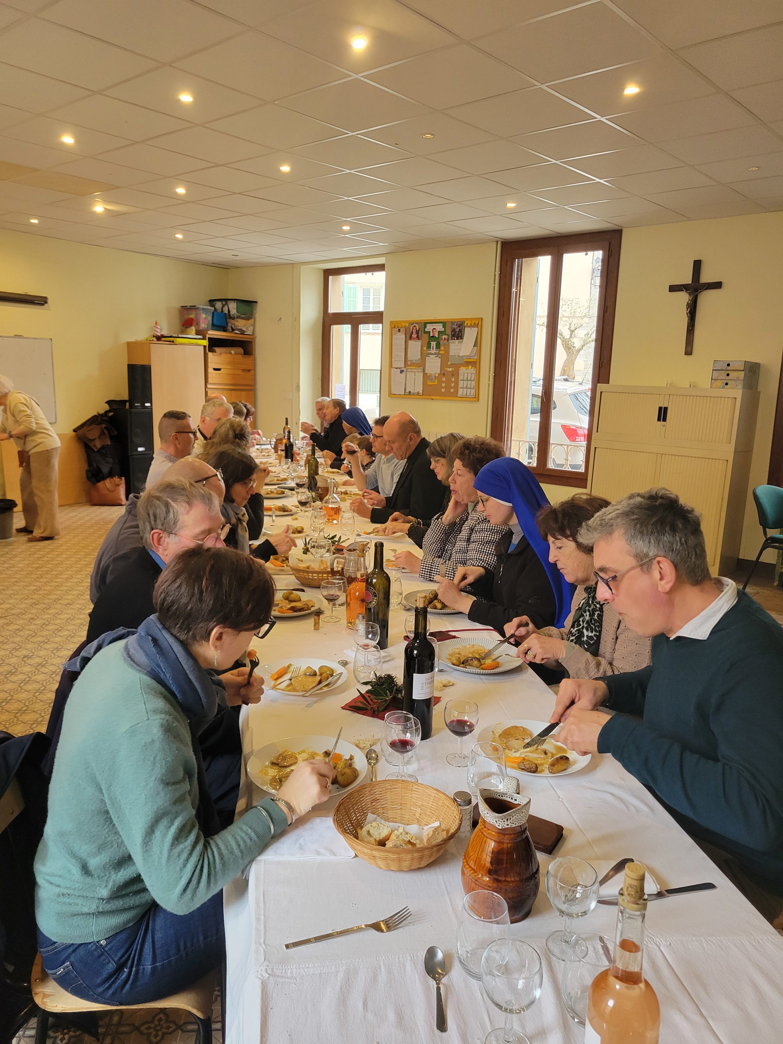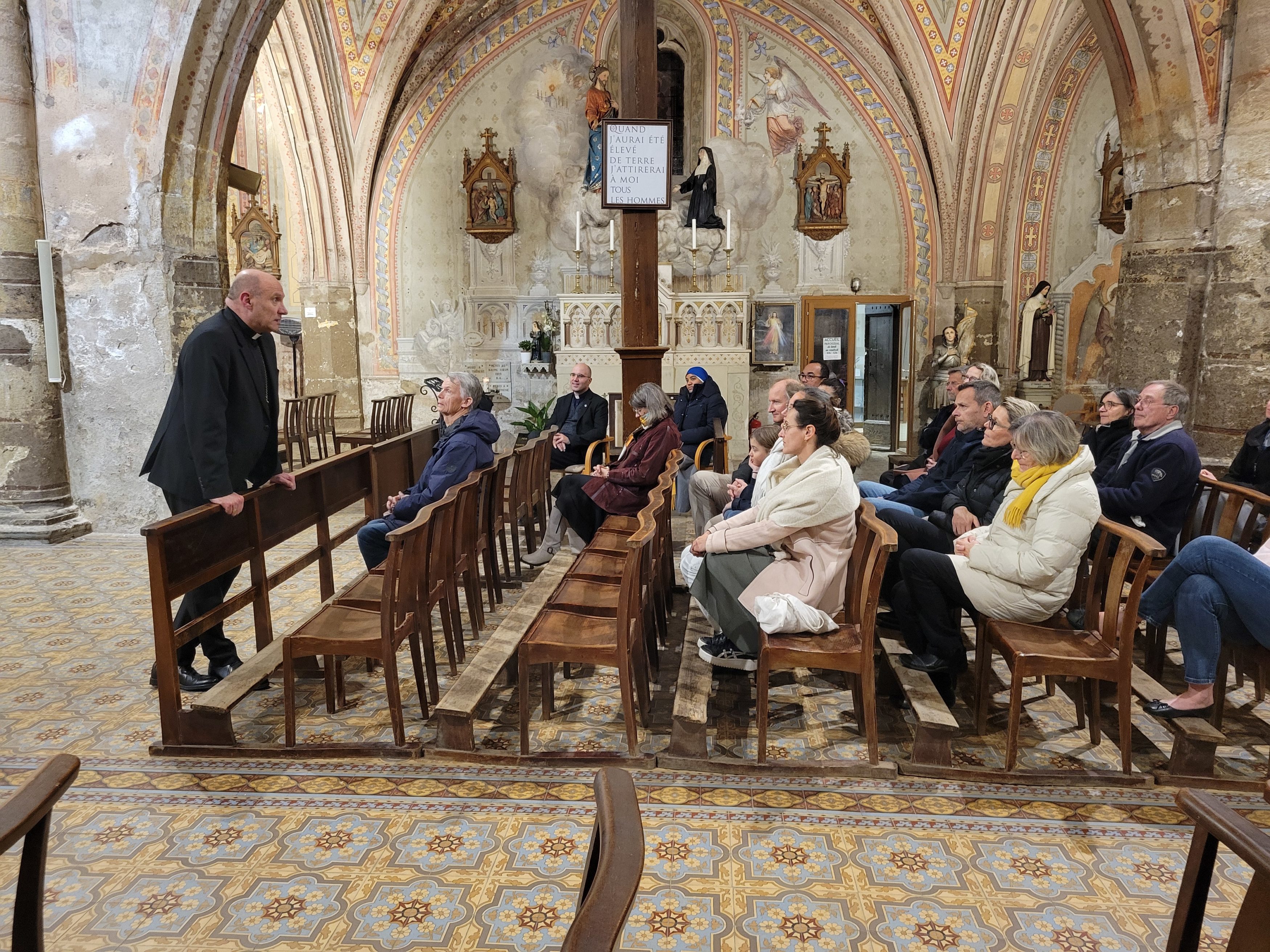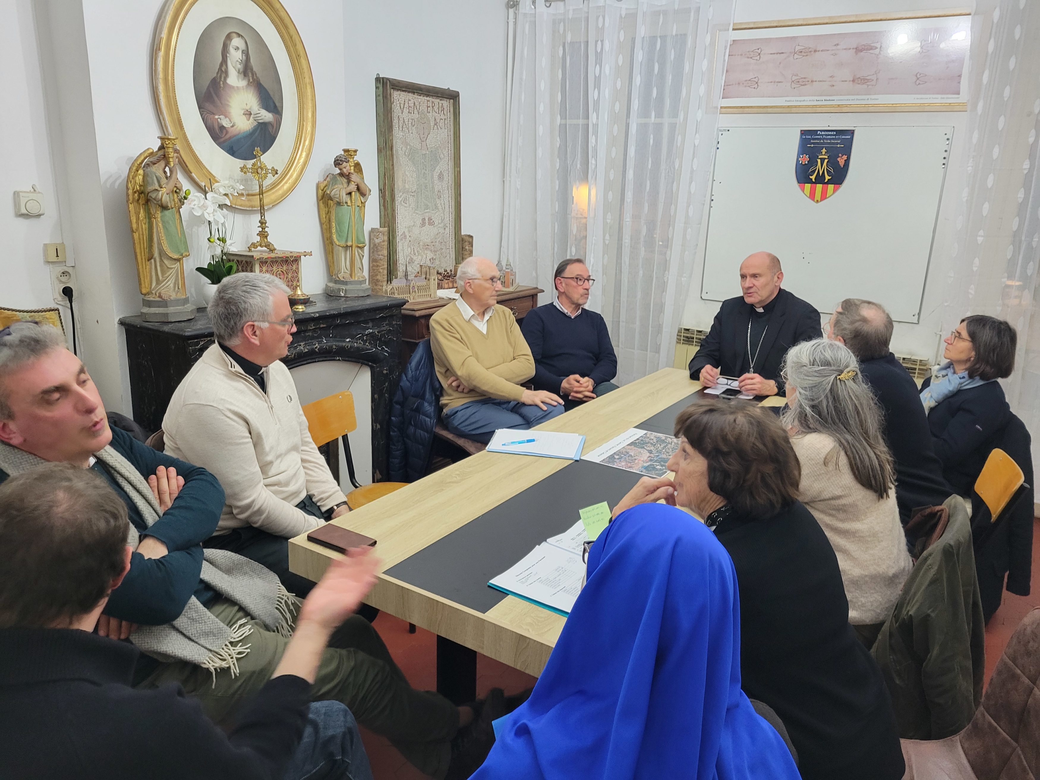 Accompagné d’une petite équipe, Mgr Touvet a passé trois jours dans les paroisses autour du Luc-en-Provence. Dans les différents villages, il a pu vivre de belles rencontres avec les paroissiens, les catéchumènes et confirmands, les responsables de l’Institution Marcel Callo (hors-contrat, sous tutelle congréganiste, et membre de l’enseignement catholique diocésain), les prêtres de l’Institut du Verbe Incarné, les sœurs Servantes du Seigneur et de la Vierge de Matara (branche féminine du Verbe Incarné), les élus locaux, le conseil économique, et la « famille en mission » à Cabasse. Visite de la base école de l’ALAT ainsi que des presbytères de Flassans et Cabasse, et moments de partage et de joie pour célébrer l’anniversaire du père Silvio et les 10 ans d’épiscopat de Mgr Touvet dans un accueil joyeux et fraternel.